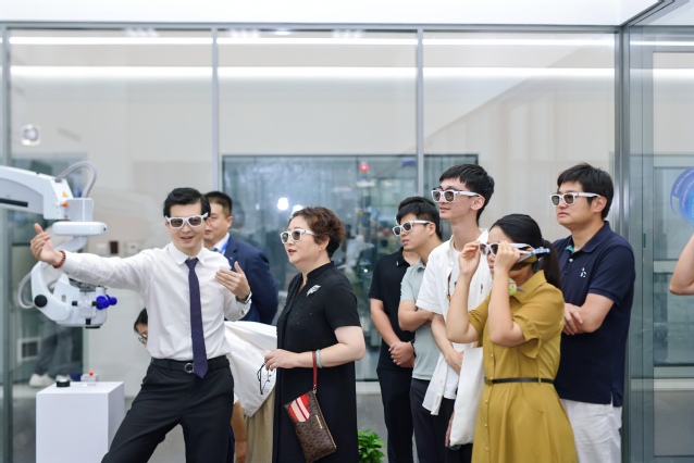 在蔡司方面的陪同下,姚谷芳一行首先参观了蔡司大中华区总部展示中心,系统了解了蔡司逾百年的发展历程、企业文化和科技创新成果。随后,在蔡司各部门负责人的引导下,深入考察了蔡司在眼科医疗技术、光学消费品市场、半导体制造技术、工业质量与研究以及显微镜系统等五大业务板块的前沿产品与技术应用,对蔡司在医疗、光学与光电领域的全球领先地位有了更加直观和深入的认识。