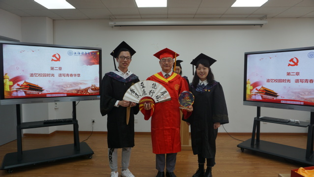 活动中,校院领导为全体毕业生党员颁发毕业生纪念章,为毕业生送上临行嘱托,期望毕业生党员以更加优异的成绩为党旗增辉,为母校添彩。毕业生纪念章不仅仅是一块勋章,更多的是寄托着母校的关怀,镌刻着母校的期许,彰显着毕业生党员的荣誉和责任。校长荣誉学位获得者沈钰涛、邱跃珏两位同学为母校送上祝福和感谢,送上我院毕业生写有校训“厚德至善 健行康民”和“感恩”的扇子,以及画有黄校长Q版头像的工艺品,寄托了对母校和黄校长的感恩之情。