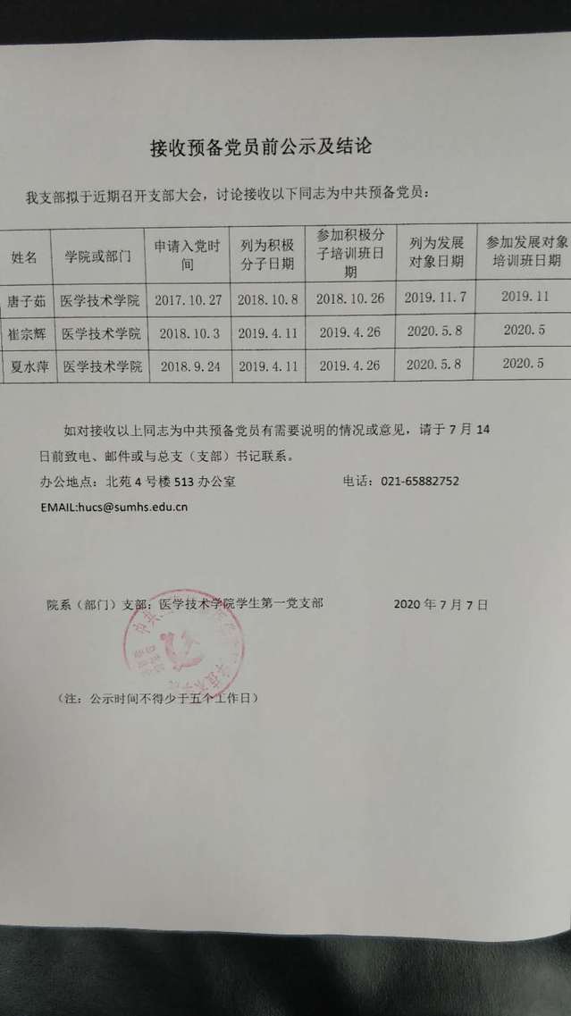 接收预备党员前公示(学生第一党支部)