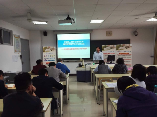 随后,学院党总支书记秦禹权老师做了《立德树人根本任务落实于高校教育教学全方位全过程》专题报告,传达了教委党委对高校思政工作的一些具体要求,提出教师自身应该做到三个根本、四个统一、四个服务等内容。同时,秦书记还强调要以本次教育思想大讨论为契机,通过问题导向,既要解决学院老师惰性问题,又要实现“不等”、“不靠”思维方式的转变,充分挖掘潜能,调动各位老师主观能动性,做好本学院本科专业建设,体现出应用型专业特色。