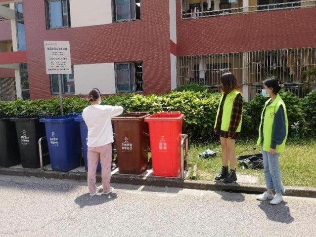 (陆锦蓉正在担任垃圾分类引导志愿者)